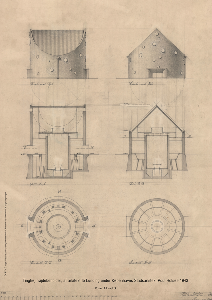 Tinghøj højdebeholder at arkitekt Ib Lunding under Københavns Stadsarkitekt Poul Holsøe 1943.