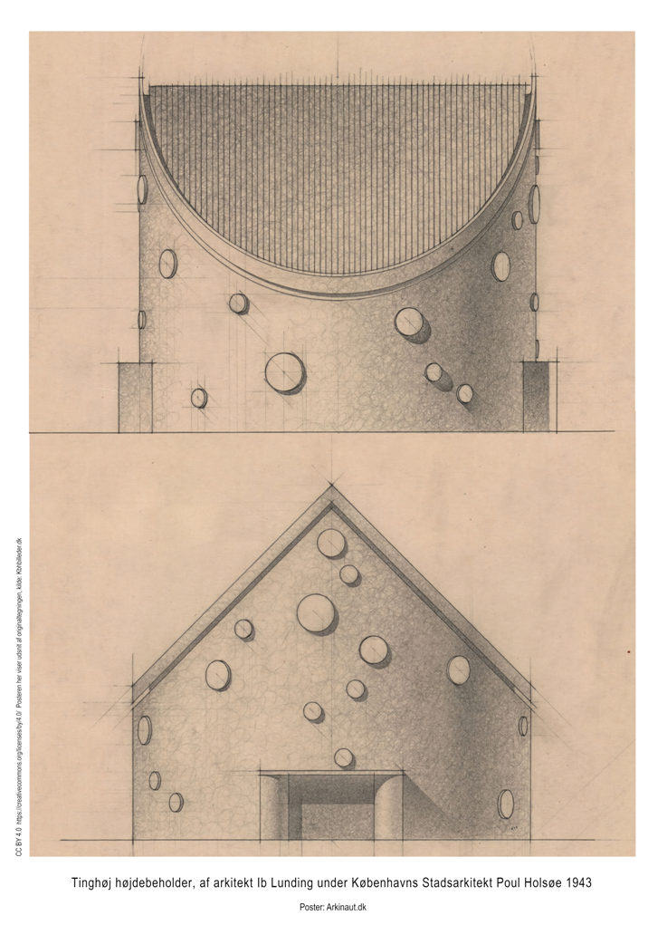Tinghøj højdebeholder at arkitekt Ib Lunding under Københavns Stadsarkitekt Poul Holsøe 1943.