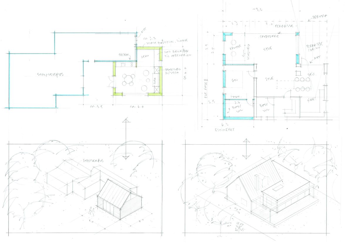 Der er både interne arbejdsskitser, og færdige præsentationstegninger. Plan, snit, facader, perspektivtegninger og isometrier.